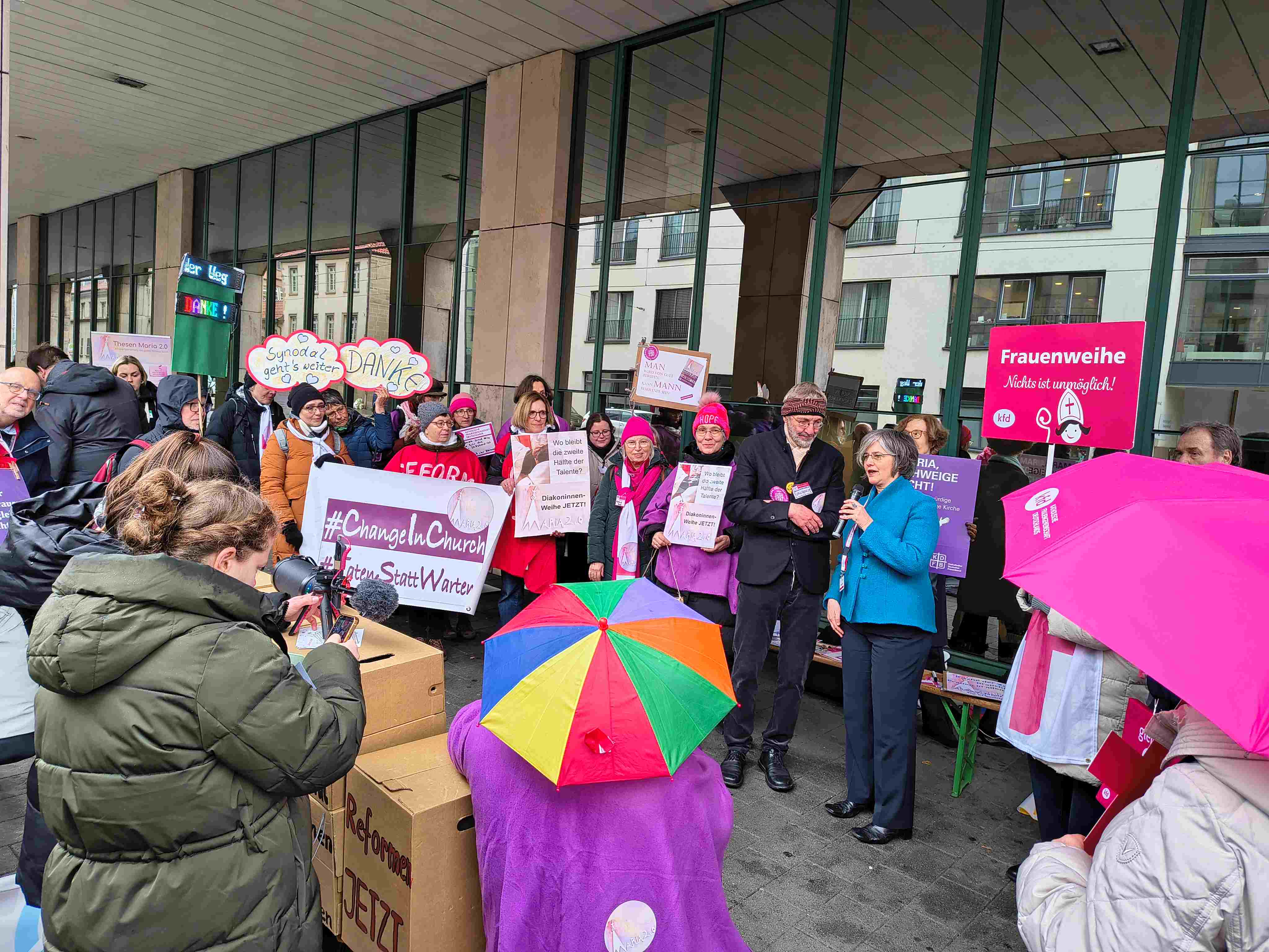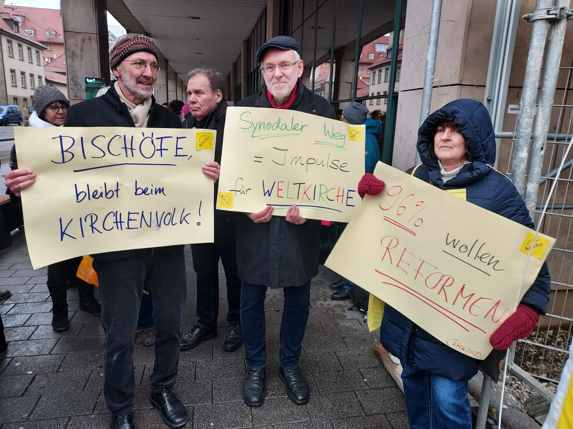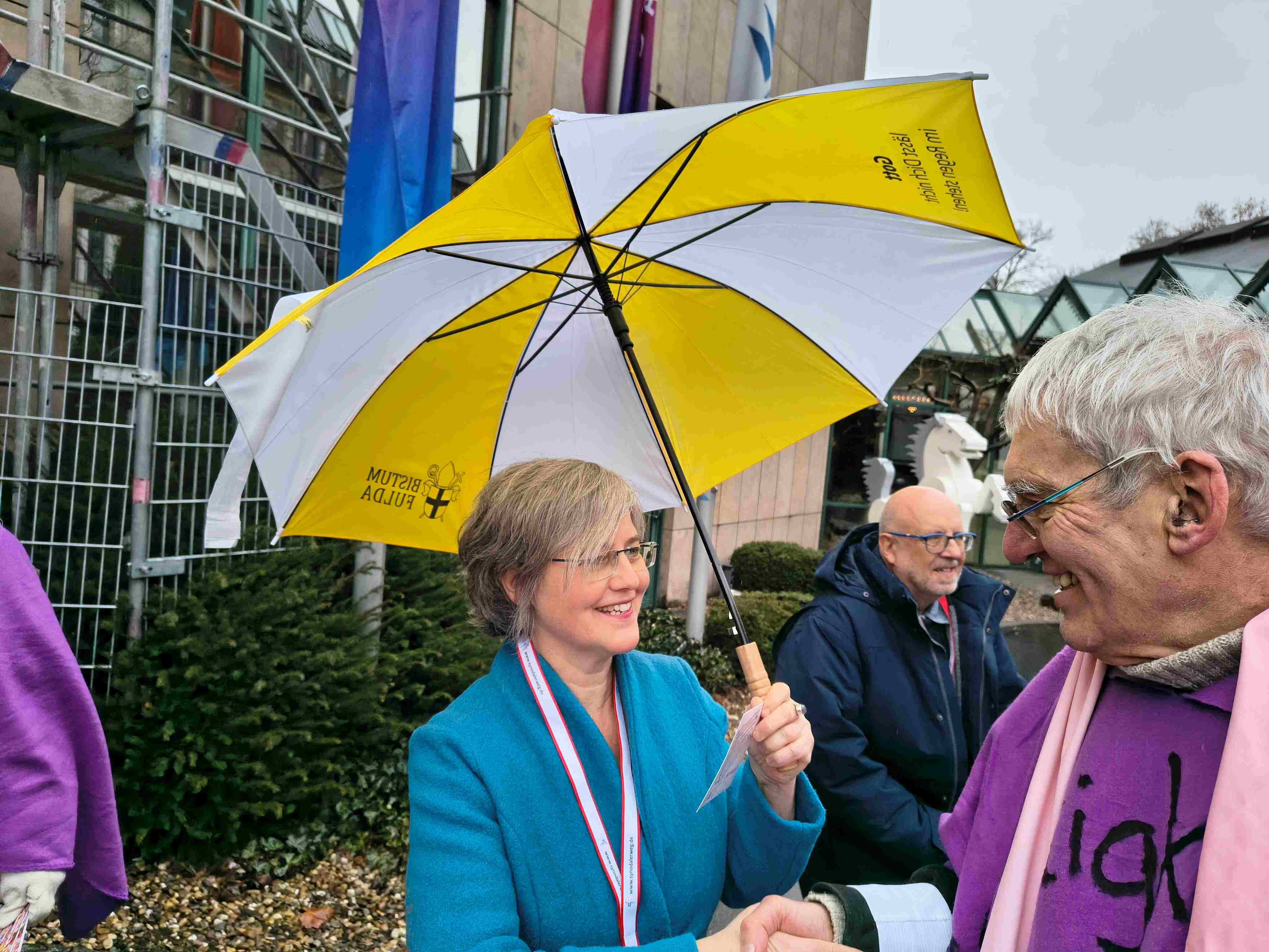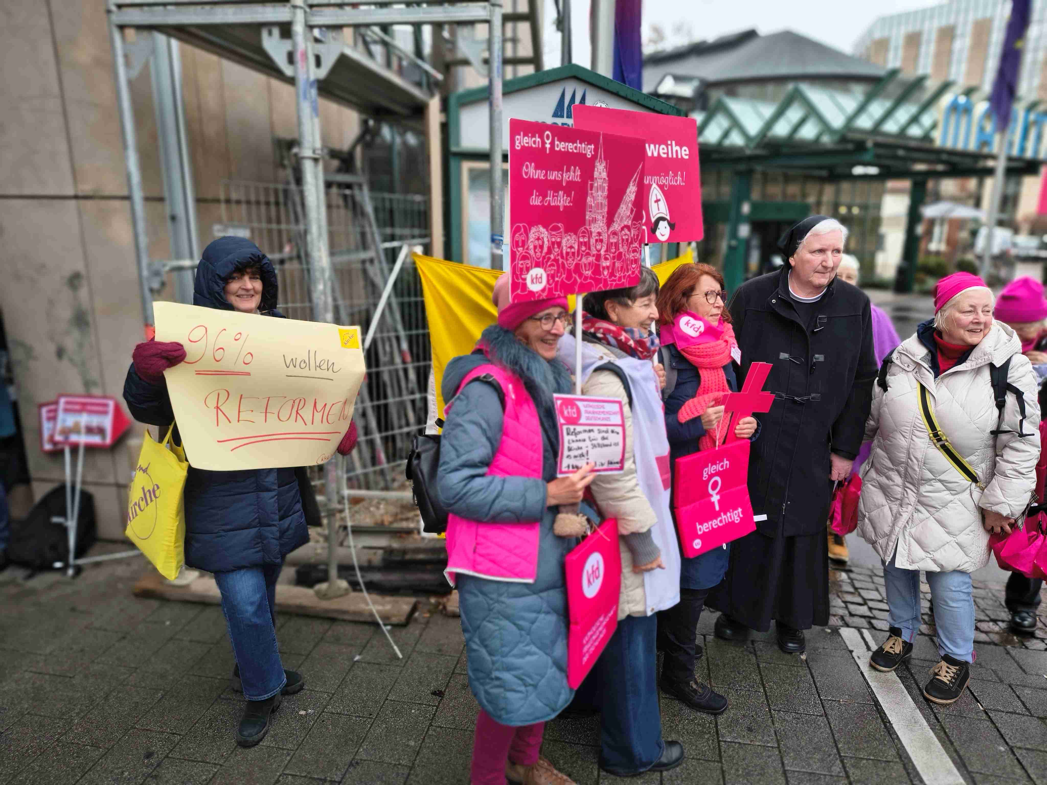 Sehr erfolgreich die gemeinsame Aktion der Reformkräfte zur Begrüßung der Synodalen vor dem Tagungshotel, bei der sich viele wechselseitig ermutigende Gespräche ergaben. > mehr Fotos