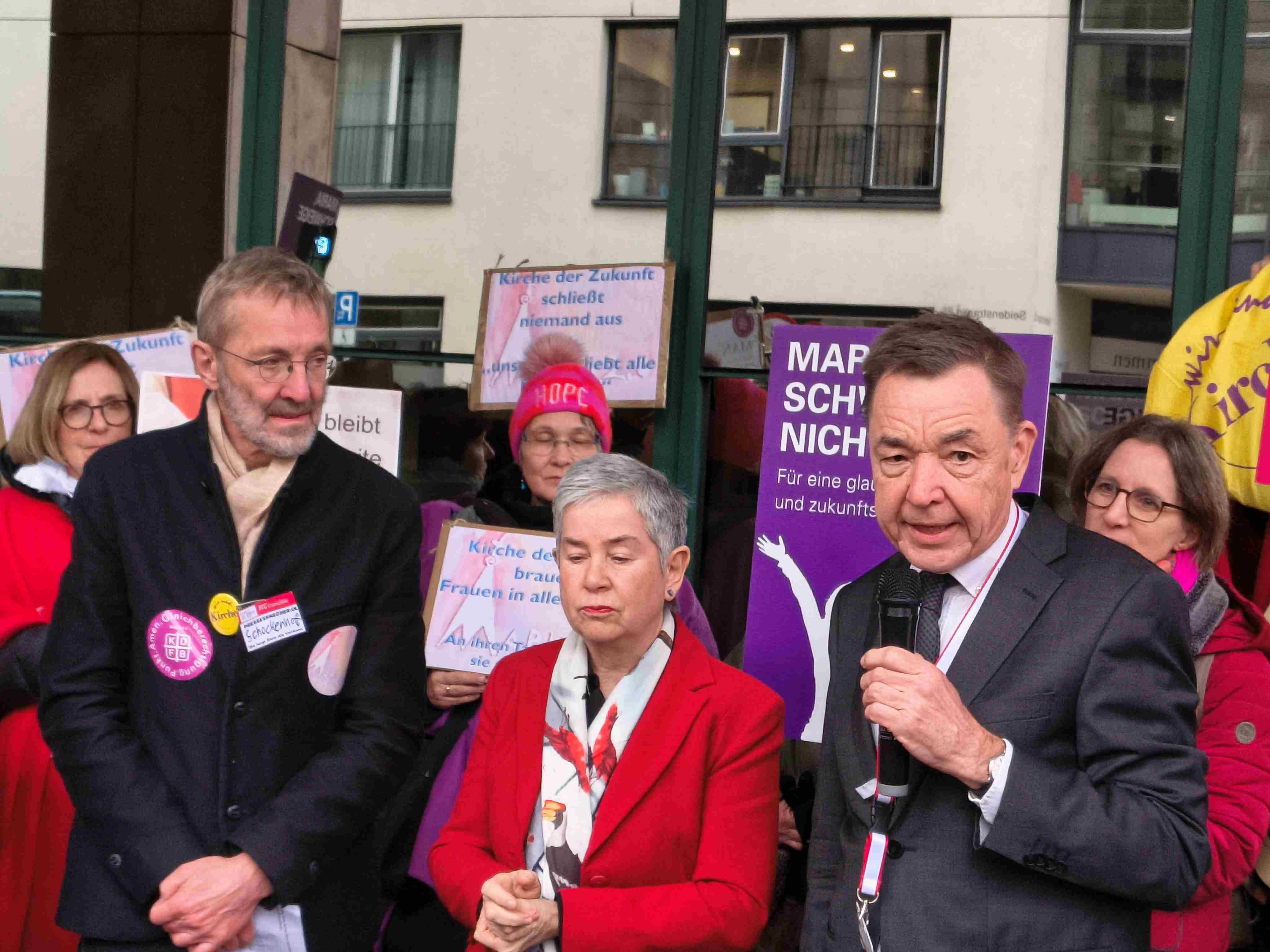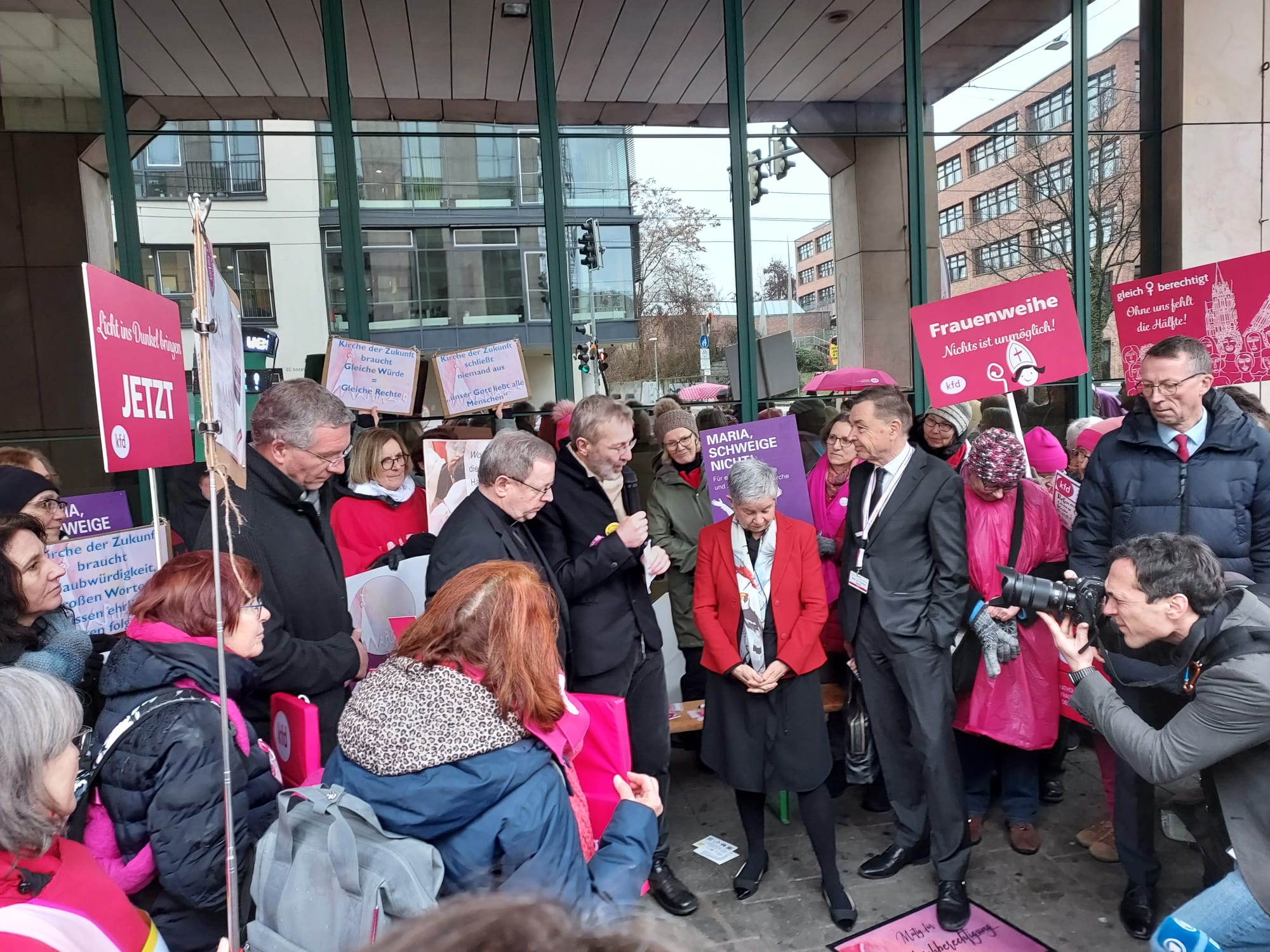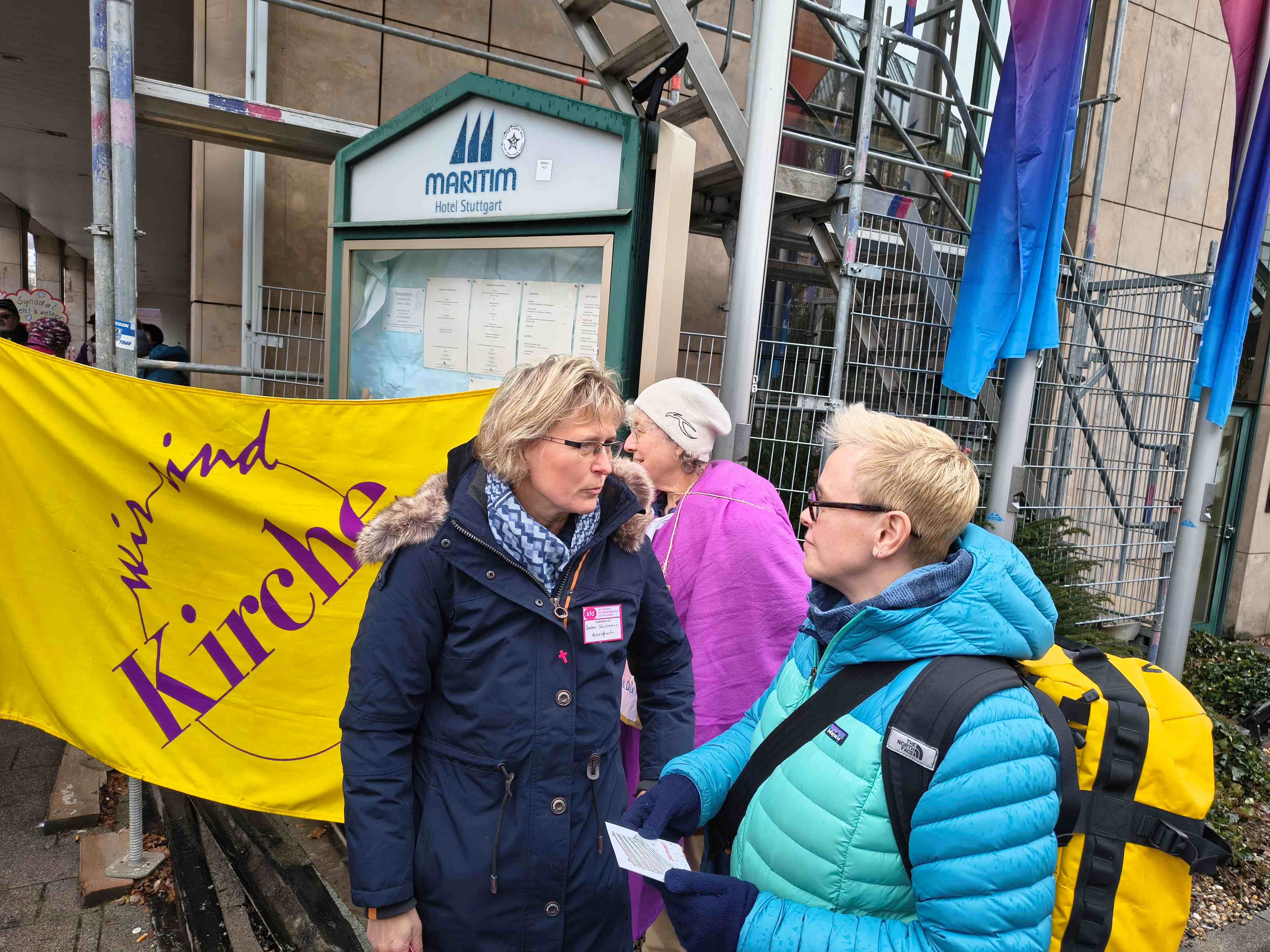 Sehr erfolgreich die gemeinsame Aktion der Reformkräfte zur Begrüßung der Synodalen vor dem Tagungshotel, bei der sich viele wechselseitig ermutigende Gespräche ergaben. > mehr Fotos