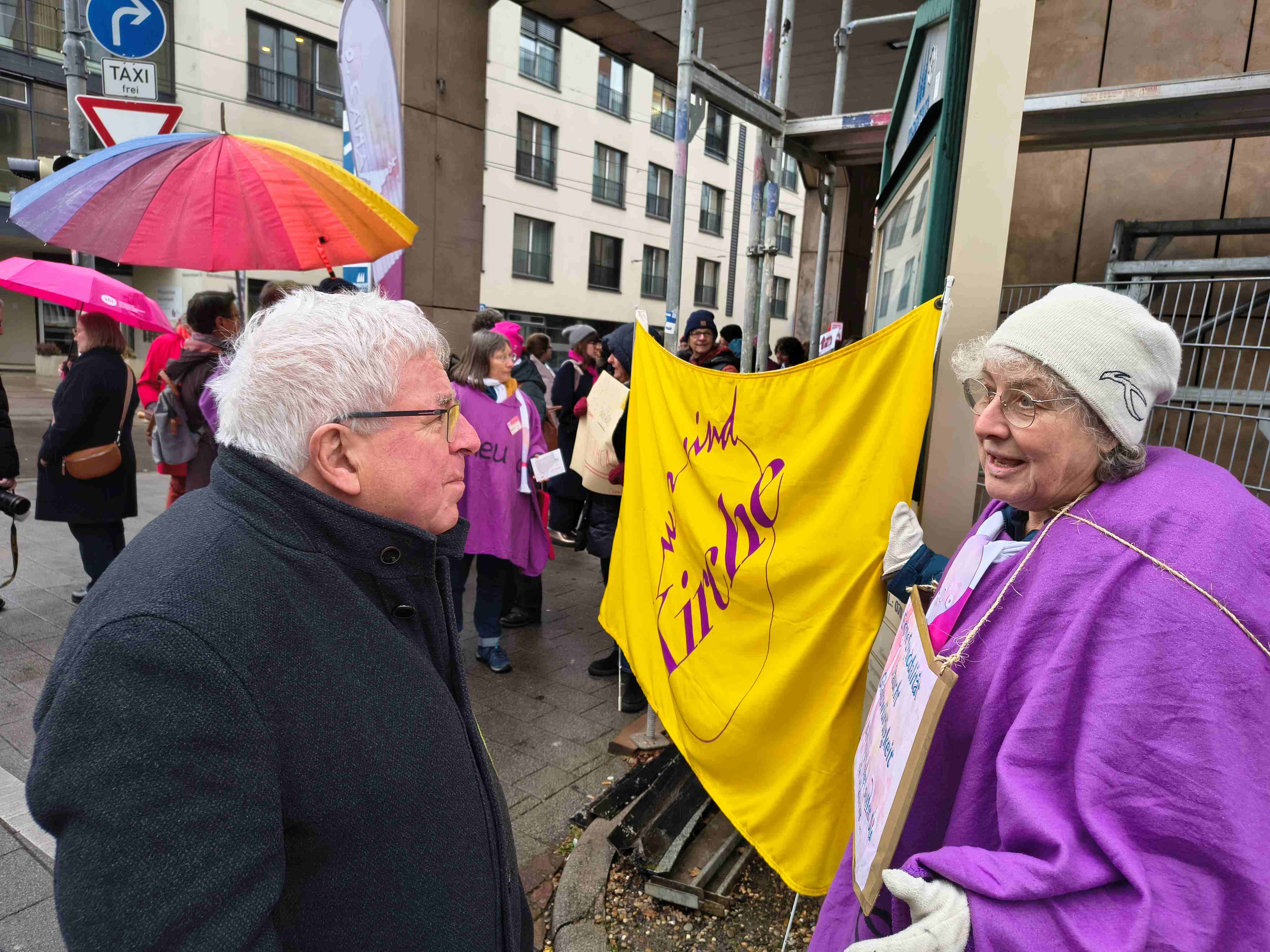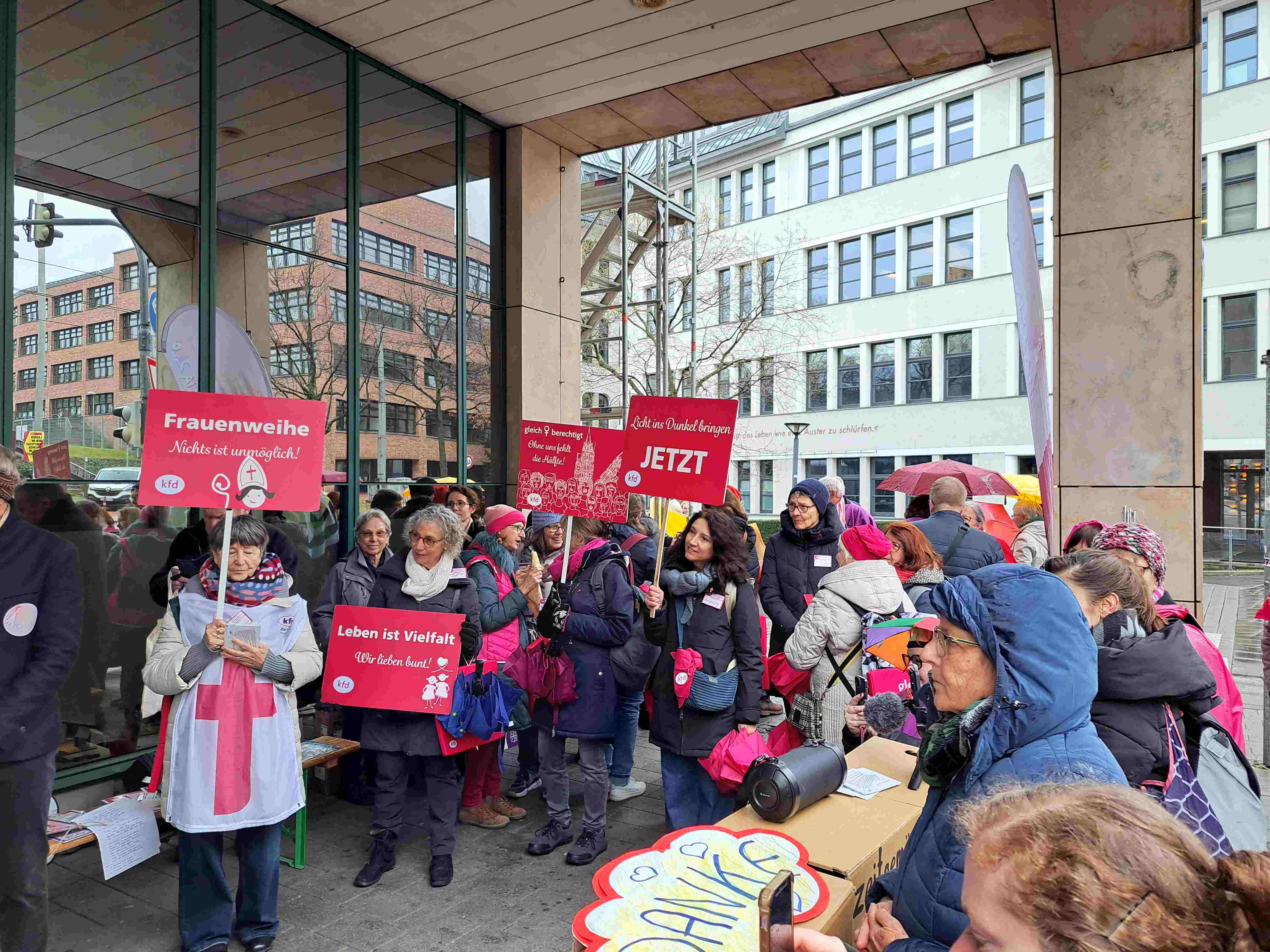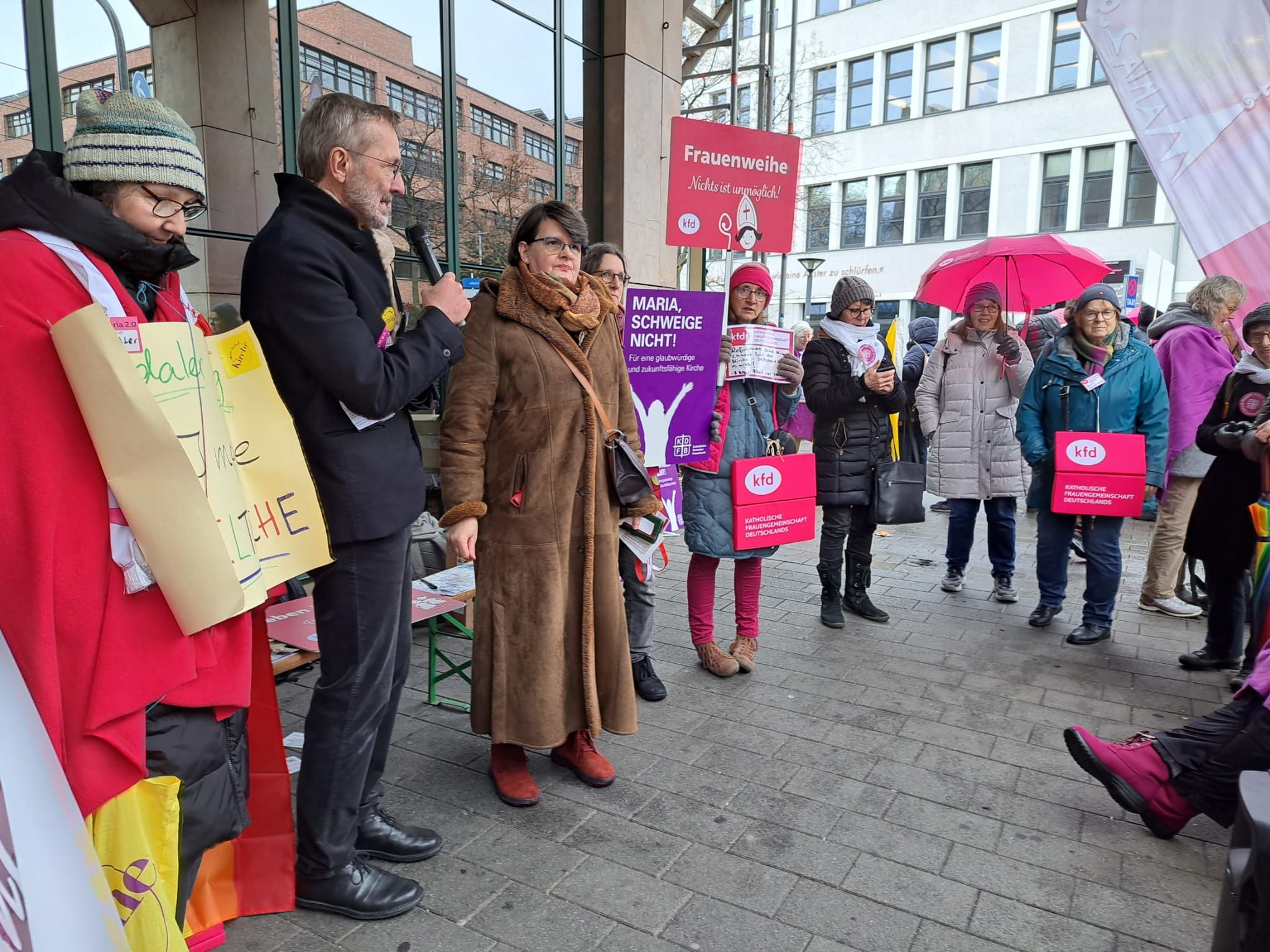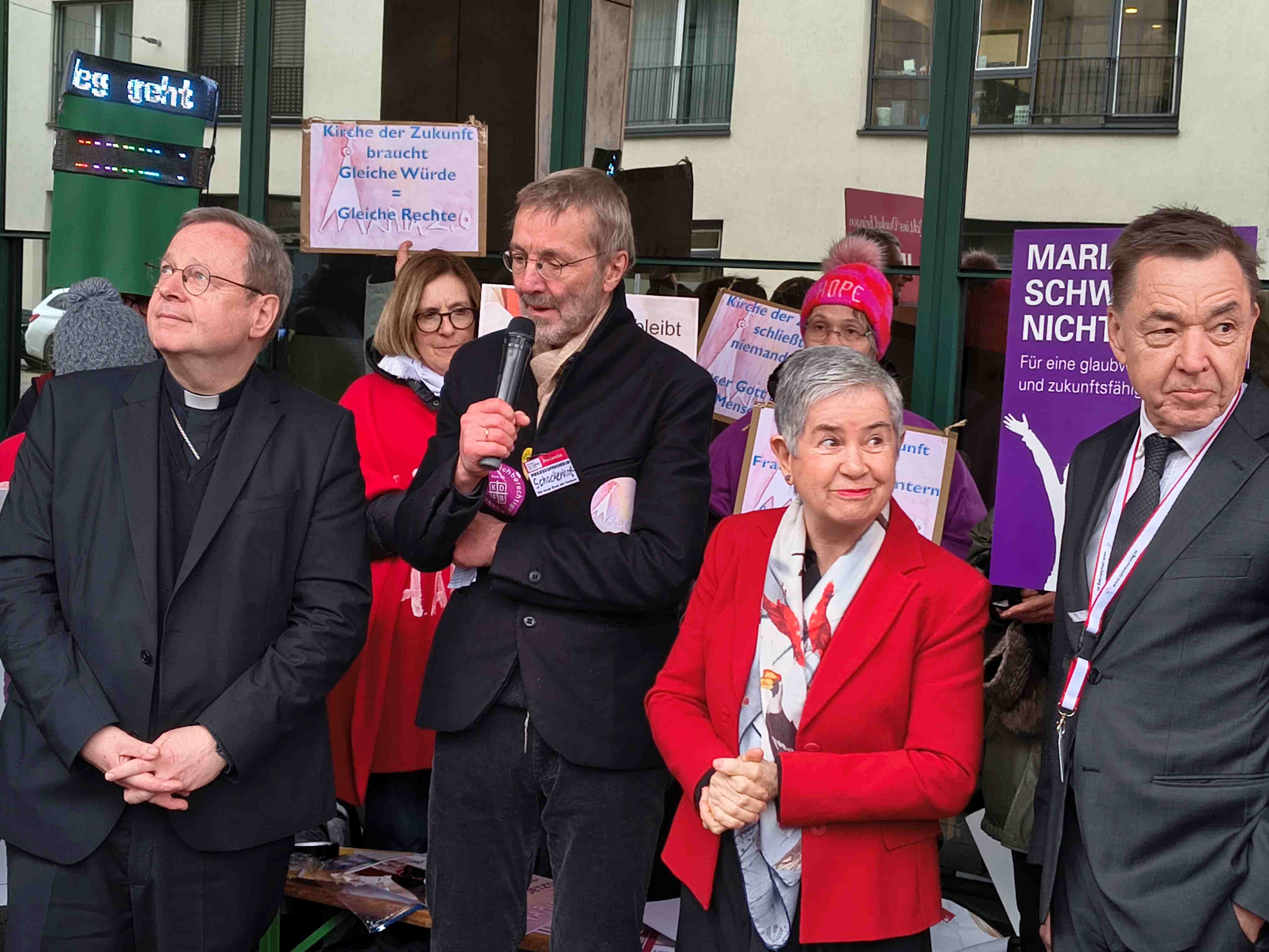 Sehr erfolgreich die gemeinsame Aktion der Reformkräfte zur Begrüßung der Synodalen vor dem Tagungshotel, bei der sich viele wechselseitig ermutigende Gespräche ergaben. > mehr Fotos